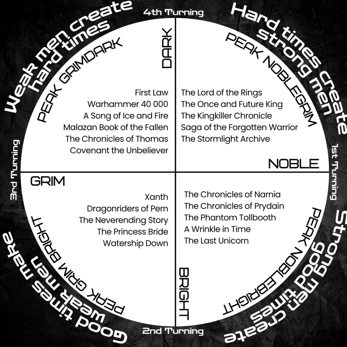 Now, this is heavy stuff for our collective cultural consciousness to process, but the implications for literature (and other media) are quite intriguing, as the cycle also seems to directly affect what is popular. When everything is going quite well, the population as a whole wants edgier entertainment—the anti-heros and morally grey characters—but when times are hard, people look for true heroes—selfless individuals who will sacrifice themselves for the sake of others.